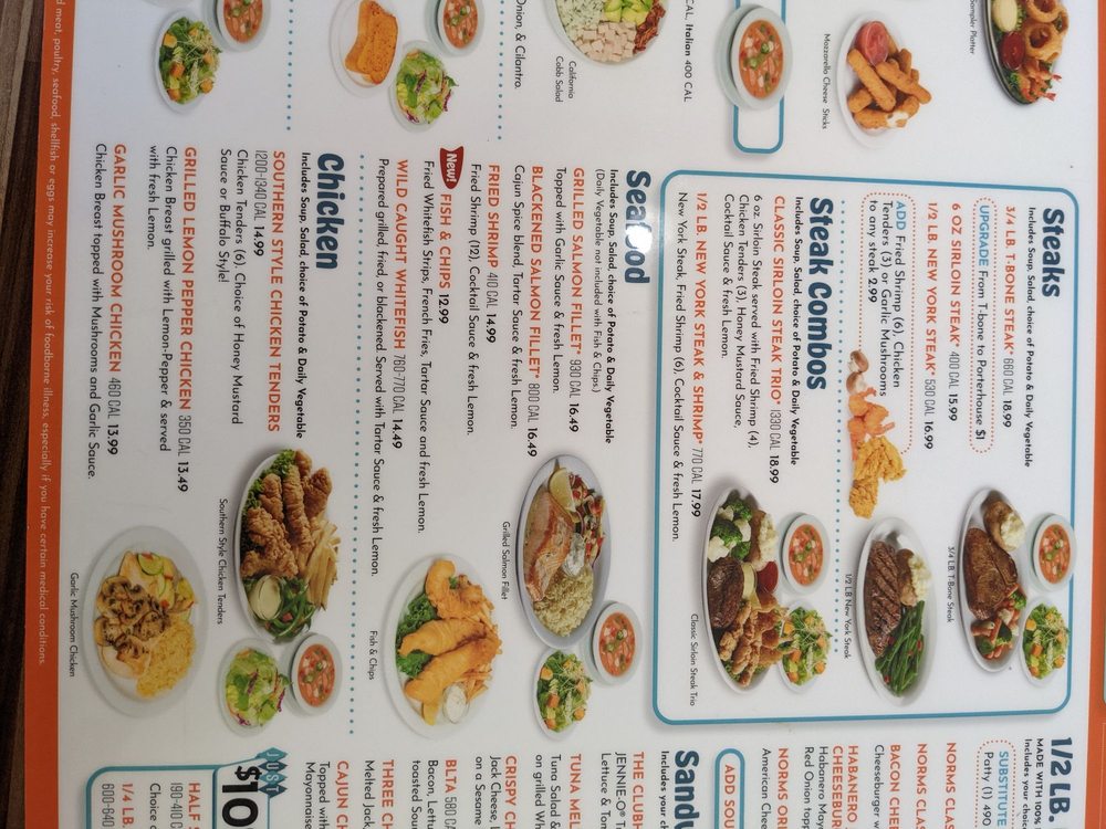 6 oz. Sirloin Steak served with 4 Fried Shrimp, 3 Chicken Tenders. Honey Mustard Sauce, NORMS Cocktail Sauce & fresh Lemon. Includes Soup, Salad, choice of Potato & Daily Vegetable.